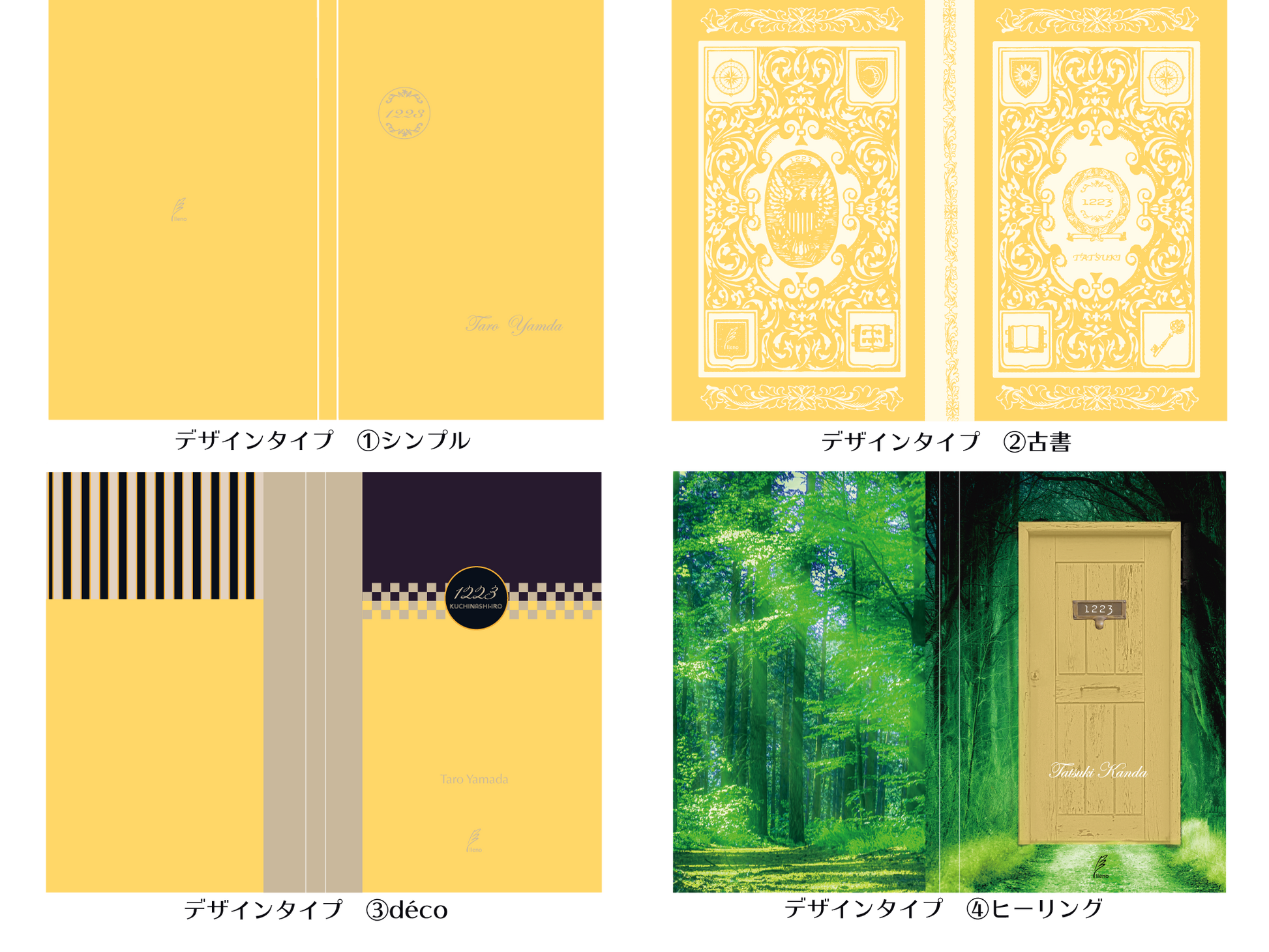 絞りの皮革のような味わいの紙に古書風のデザイン。